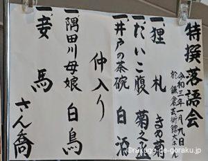 今年初めての落語会です。嬉しかったです。加えて、特撰落語名人会です、さん喬師匠、白酒師匠、白鳥師匠、菊之丞師匠、そうそうたるメンバーでした。さん喬師匠の妾馬、八五郎、三太夫、それに御殿様、三人が目の前にて演じてる様でした。もう最高ですね。又、白酒師匠の井戸の茶碗、高木佐久左衛門と千代田卜斎の娘、お絹さんが一度会っていたなんて、初めての流れでした、ビックリでした。