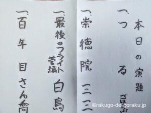 が、今日の白鳥師匠、お客さんを巻き込んでの熱演でした。私も巻き込まれての、最後のフライトでした。白鳥師匠、お疲れさまでした。ごはんつぶさん、前座修業、頑張ってください。