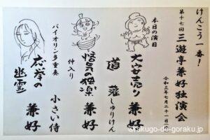 兼好師匠の落語会、お人柄なのでしょうか、いつも終わった後も、気持ちよく帰れます。大安売りの、親方のため、ご贔屓様のため、の繰り返しが妙に楽しくて、食入りました。悋気の独楽は、小僧さんが、三人のコマを回す場面の際の、ニタついているような様が浮かぶようでした。応挙の幽霊では、幽霊との、差しつ差されつの場面が、とても仲良さそうで、不思議な情景に見えました。兼好師匠ならではの演技でした。演目表の幽霊の絵も、師匠好みのお顔なのでしょうね。