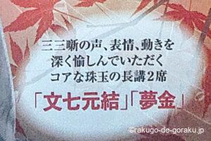 三三師匠の独演会、毎回の感想になってしまいますが、タップリと長講二席、満足の落語会です。